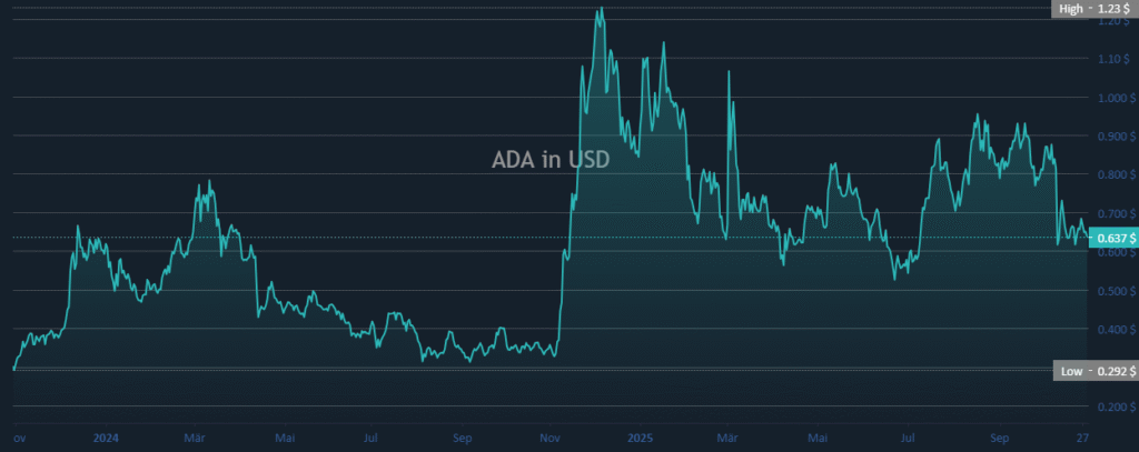 Cardano (ADA) traded steadily around $0.63 after a volatile year marked by sharp gains and subsequent corrections. The cryptocurrency displayed resilience throughout 2024 and 2025 despite heavy market fluctuations. Its performance highlighted steady accumulation and sustained participation within the broader blockchain ecosystem.