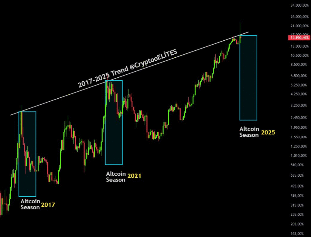 Meanwhile, CryptooELITES also shared a long-term chart covering 2017 to 2025. It showed that each major bounce on an ascending trendline has coincided with an altcoin season. This occurred in 2017 and again in 2021. According to the data, a similar formation is currently underway in 2025.