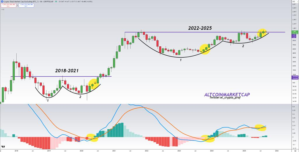 The analyst pointed out rounded bottoms across major altcoins, similar to the accumulation zones seen before the last bull run.