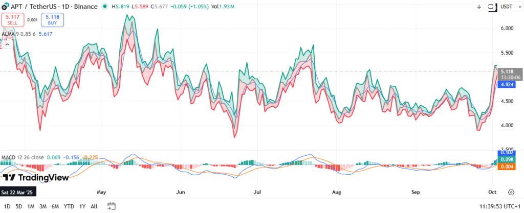 APT trades near $5.11 after bouncing strongly from the $4.00–$4.20 support region in recent sessions. The move follows several cycles of rallies and corrections, which created a volatile but recognizable trading range. This rebound currently reflects strength, as the token pushed above minor resistance points.