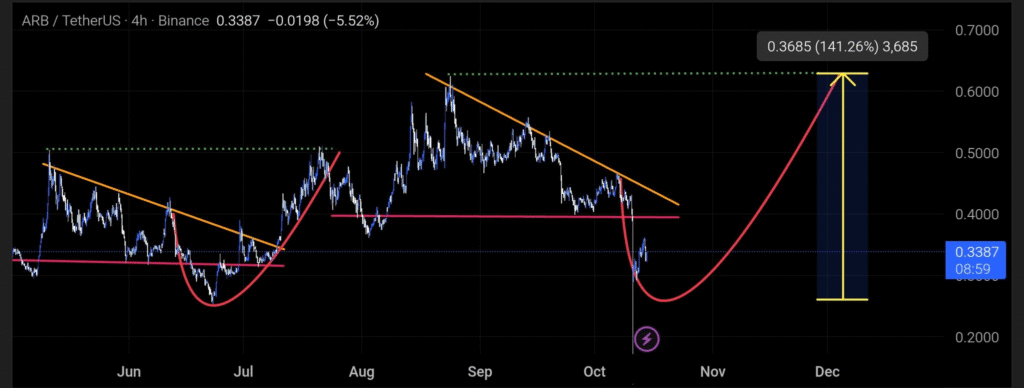 According to LaCryptoLycus, this pattern suggests that ARB could experience a 150% price increase if the breakout confirms. The current price action indicates a phase of accumulation, with higher lows forming around the $0.33 mark.Â