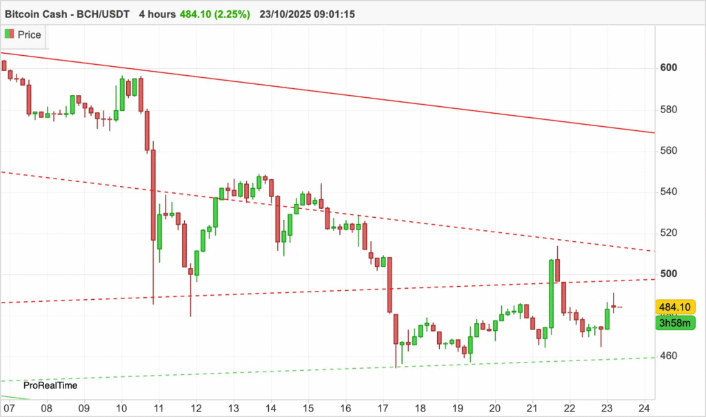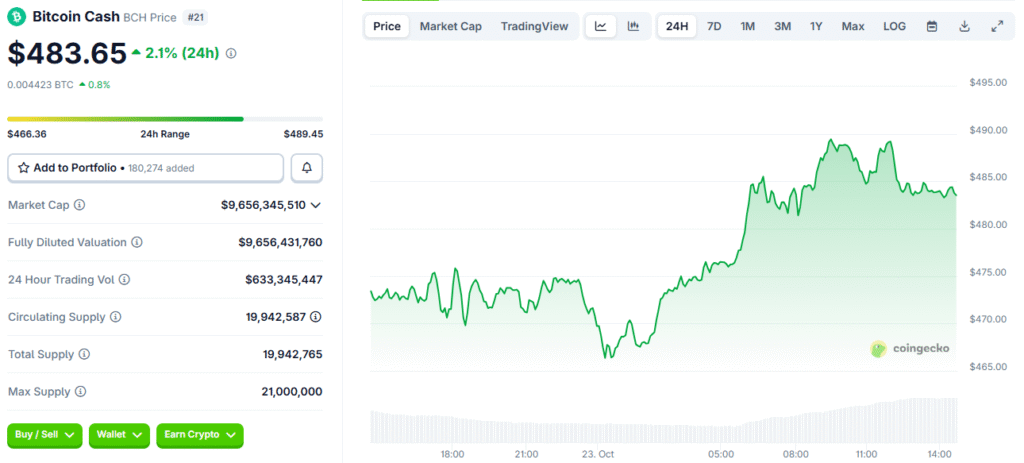 - itcoin Cash is up 3% in 24 hours, trading near $487 after ETF news.