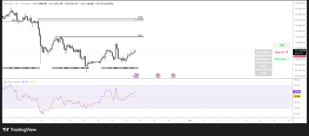 The BTC/USD 4-hour chart remains efficient but shows improving signals of recovery. Bitcoin rose 1% in the past 24 hours and now trades above $111,000. The price earlier faced resistance from the 50-day Exponential Moving Average (EMA) at $113,329 but managed to regain strength after testing support near $106,453.