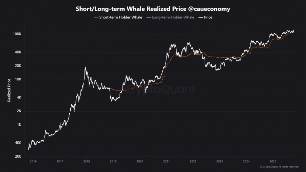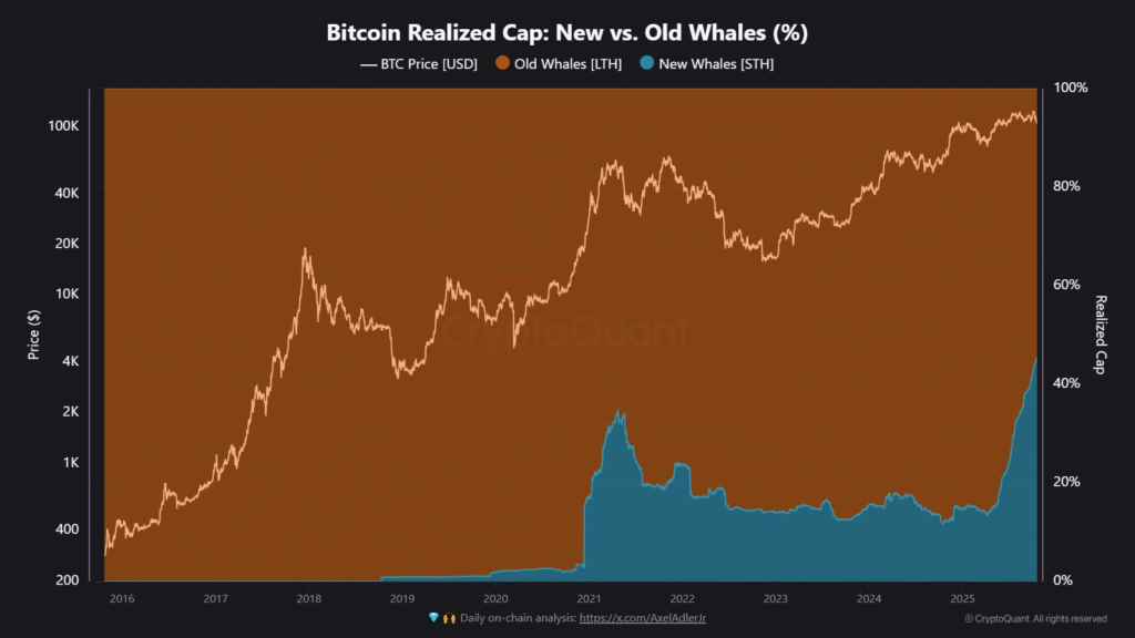 According to CryptoQuant, these new whales currently hold about 45% of the total whale realized cap, a sharp rise from under 20% earlier in the year. This suggests that a large portion of the market’s big holders entered during recent price surges.