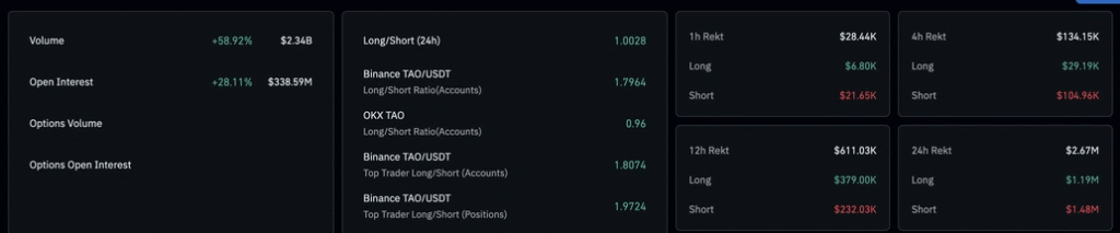 Open interest in TAO futures has risen to $338.59 million, marking a 28% increase in 24 hours. Trading volume also jumped by 59% to $2.34 billion, indicating higher market participation. Analysts note that this level of activity often precedes further price movements.