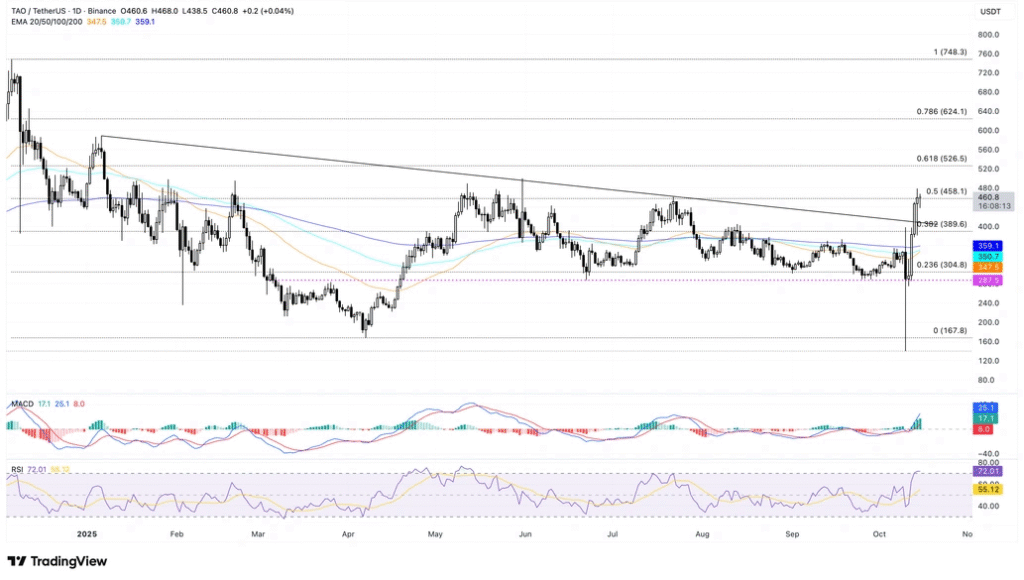 If TAO closes decisively above $458, the next potential resistances lie at $526 and $624, corresponding to the 61.8% and 78.6% Fibonacci levels. Technical indicators are showing bullish momentum. The Relative Strength Index (RSI) at 72 is in overbought territory, and the MACD shows continued upward movement.