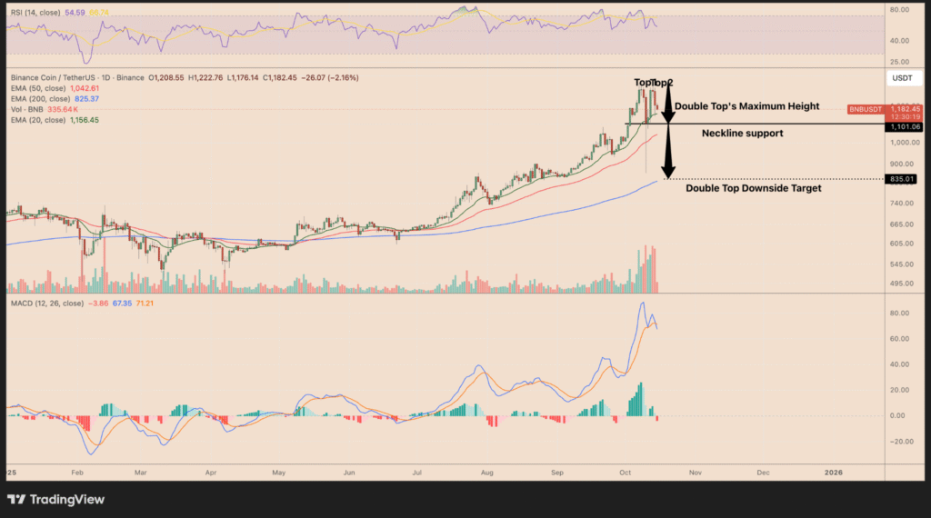 - BNB’s double top pattern suggests a 30% correction towards $835 by November.