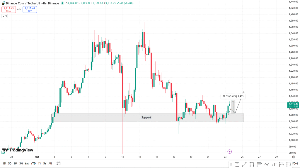On the 4-hour chart from TradingView, BNB has stayed above the $1,070 support area, which has consistently limited downside moves. The asset is currently trading near $1,115 with a 0.49% gain in the last session. Analysts are observing a possible breakout above $1,120, with short-term projections aiming for $1,150. This would mark a potential 3.6% gain from current prices.