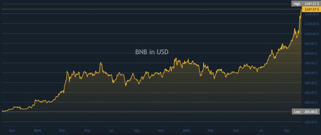 The price action highlights multiple breakouts supported by high trading volumes and expanding interest from traders. BNB successfully cleared earlier resistance zones near $1,050–$1,100, establishing a new base for continued growth. This upward move positions the asset among the leading performers in the current crypto cycle.
