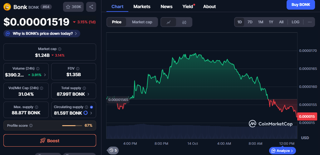 Bonk (BONK) recorded a modest decline of 3.15% in the last 24 hours, settling at $0.00001519. The token’s movement signals a cooling phase following a recent rally that lifted prices to short-term highs. Despite the pullback, BONK maintains a total market capitalization of $1.24 billion, reinforcing its position among leading meme coins.