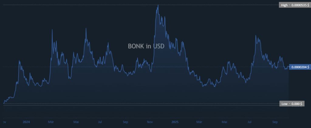 Historically, BONK has demonstrated repeated price surges followed by steep corrections, characteristic of speculative meme assets. The token remains well below its all-time high of $0.0000535 but is gradually forming a base structure. Sustained price stability near $0.0000200 indicates accumulation and may set the foundation for a new recovery cycle.