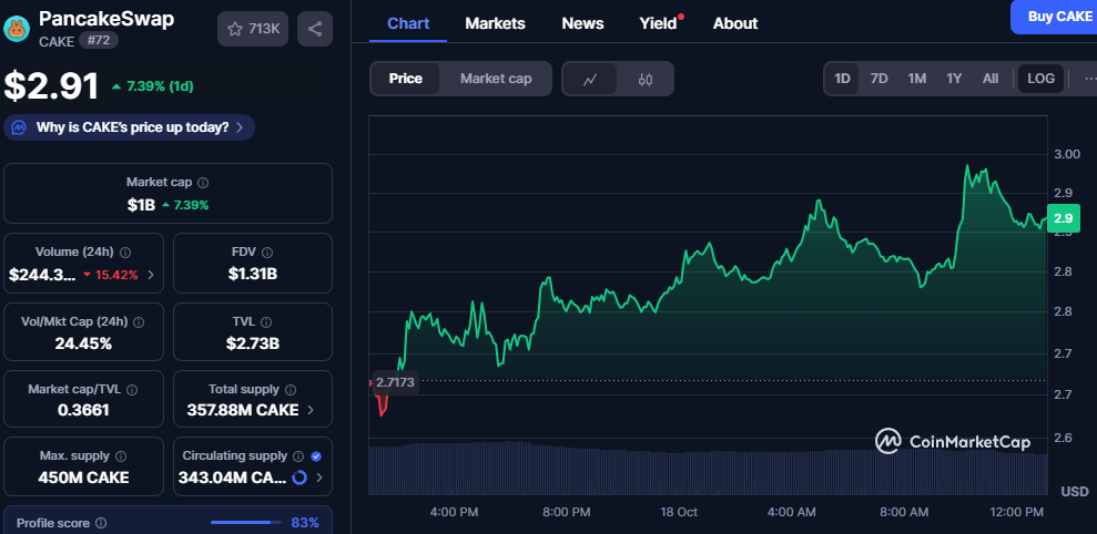 PancakeSwap’s native token, CAKE, recorded a sharp price recovery, reaching $2.91 after a consistent upward movement in the past day. The token gained 7.39% in the last 24 hours, signaling renewed strength across the decentralized exchange market. Its performance pushed the market capitalization to $1 billion, showing solid growth momentum.