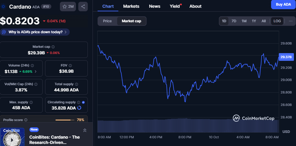 • Range-bound with bite: ADA trades near $0.8203 while market cap hovers around $29.39B, showing 2–3% intraday swings.
