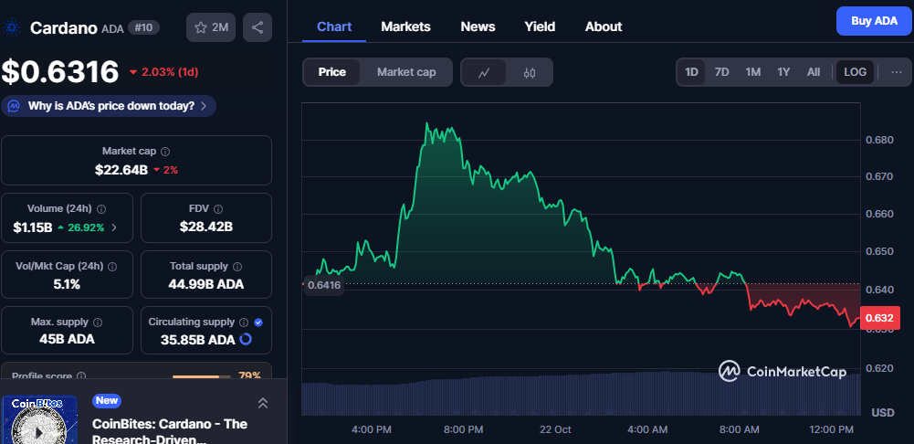 Cardano (ADA) traded lower on Tuesday after facing strong resistance near the $0.68 level. The token slipped to $0.6324, recording a 1.59% decline in the past 24 hours. Despite the drop, ADA remains among the leading cryptocurrencies by market capitalization, signaling ongoing market participation.