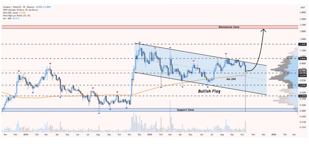 Cardano is forming a bullish flag pattern on the three-day chart against Tether (USDT). The price remains slightly above the 200-day moving average (MA 200) near $0.65, suggesting stability after recent turbulence. The chart shows a strong support zone at $0.39 and a resistance zone between $1.30 and $1.80.