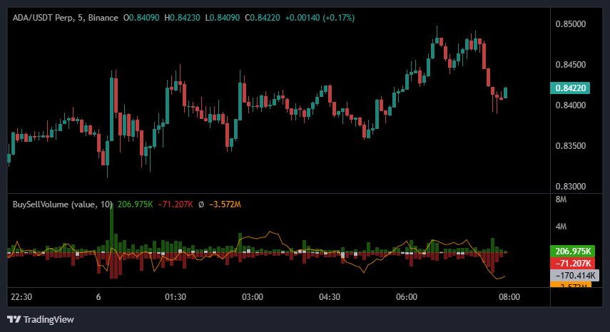• The 5-minute chart reveals controlled volatility, with buyers and sellers maintaining equilibrium as ADA consolidates near $0.842.