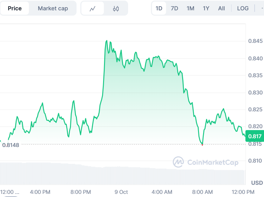 While BullZilla dominates the presale conversation, Cardano is capturing technical traders’ attention. ADA is currently trading at $0.84, up 1.34% in the last 24 hours, consolidating within a symmetrical triangle formation. Analysts note that the $0.90 resistance level is becoming the main battleground for a potential breakout. This pattern has fueled growing interest in cardano price prediction models, as momentum builds heading toward late October.
