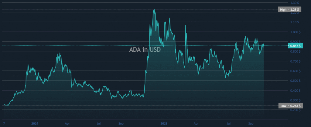 ADA was very volatile between 2023 and 2025 and then it has evident accumulation and price correction phases. The price of the token moved between 0.243 and 1.23 creating a market structure that is resistant to the price shocks with repetitive recovery trends. ADA retracted during this period and it is an indication of a firm foundation on the previous levels of support.