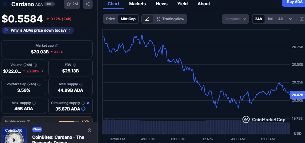 Cardano (ADA) has recently experienced a 3.12% decrease in its price, raising concerns about the cryptocurrency’s short-term outlook. Currently priced at $0.5584, ADA has seen some fluctuations in the past 24 hours, with volatility becoming more evident. Despite its position in the top 10 cryptocurrencies by market capitalization, the recent drop signals that Cardano may be facing a period of downward pressure. Traders are now monitoring whether ADA can stabilize and reverse this trend or if it will continue to decline.