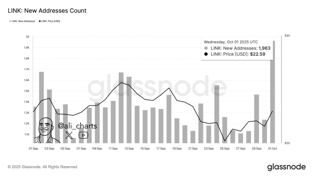 Chainlink has been showing consistent growth, with an increase of 1,963 new addresses in its network throughout September. Ali Martinez’s data from Glassnode show this surge aligns with a gradual rise in LINK’s price, which reached $22.59 on the same day.