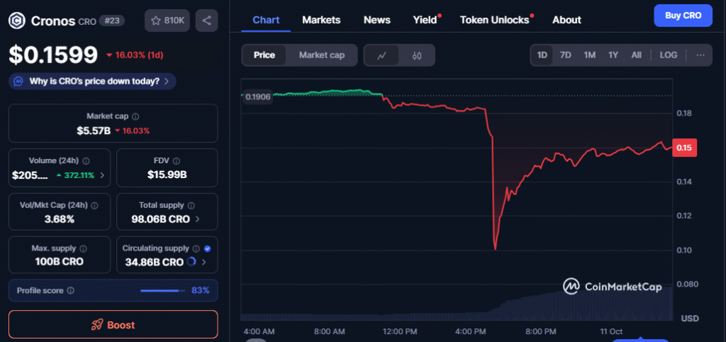 Cronos ($CRO) experienced a sharp 16% decline to $0.1599 amid growing global market volatility. The move followed U.S. President Donald Trump’s statement that China plans to impose broad export controls effective November 1, 2025.