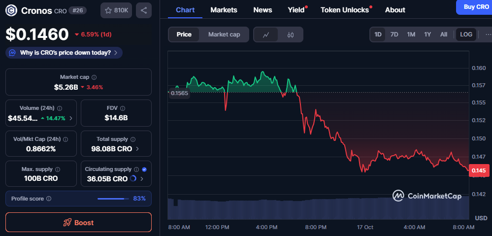 Cronos (CRO) recorded a 6.59% drop in the past 24 hours, falling to $0.1460. The decline reflects short-term selling momentum across major exchanges. However, trading activity remains strong, showing that the market continues to engage despite the pullback.