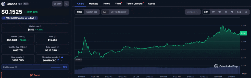 In the past 24 hours, Cronos rose 4.98% to $0.1525, reaching an intraday high of $0.1537. Trading volume increased by more than 70%, totaling $36.46 million. The market capitalization rose to $5.5 billion, driven by renewed interest from both retail and institutional investors.