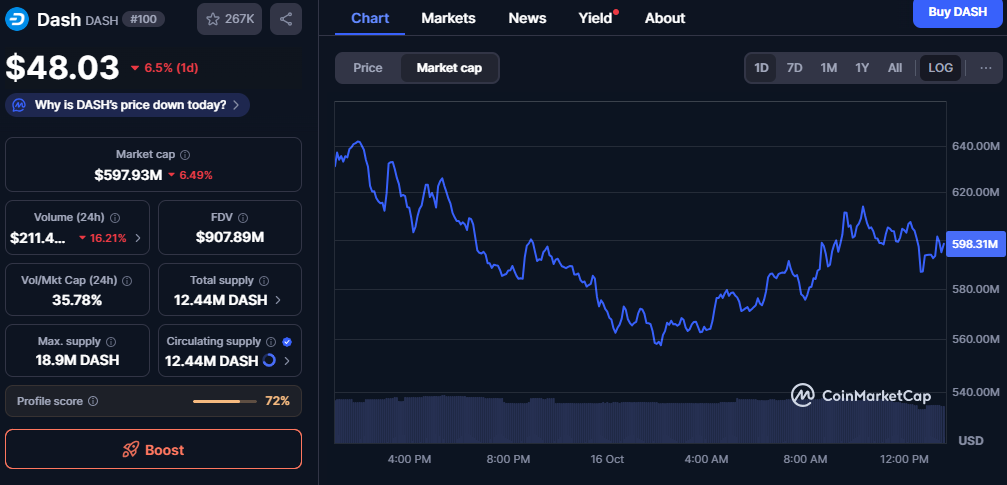 Dash (DASH) was last updated, and as of the latest update, it is priced at $48.03, and this is a fall by 6.5% in the past 24 hours. Its market capitalization is 597.93 million with a decline of 6.49 percent, which correlates with the negative price trend. The trading volume of 24 hours is trading 211.4 million, which is reduced by 16.21 per cent indicating that there is a slowdown in the selling activity following a wave of pressure.