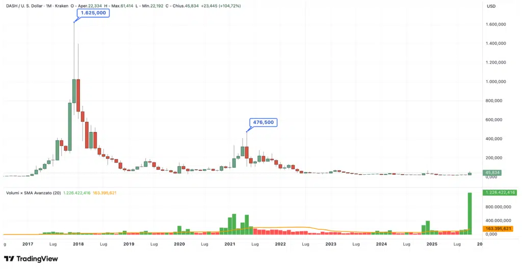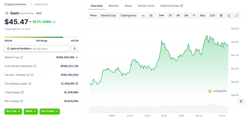 Dash (DASH) recorded a 104% rally in October, reaching $45.47 at the time of writing. The cryptocurrency broke out of a prolonged range, confirming bullish momentum supported by record trading activity.