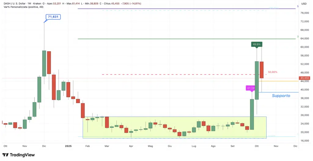 Dash’s breakout from the box range, which had contained the price since February, confirms a shift in trend. The range ended in late September, followed by a sharp weekly candle showing a 67% gain the strongest performance in a year.