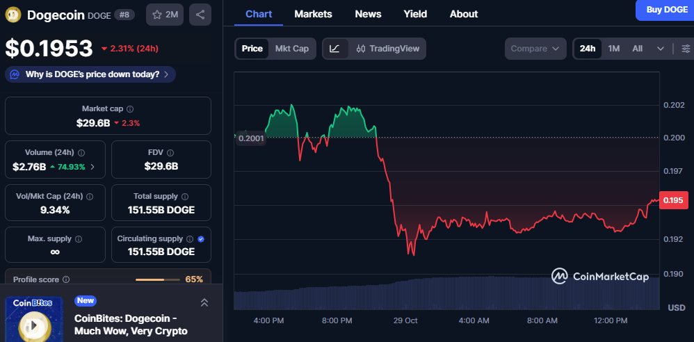 The Dogecoin price recorded a minor decline over the last 24 hours, slipping by 2.31% to trade at $0.1953. The cryptocurrency opened near $0.2001 before experiencing downward pressure across the trading session. Despite the fall, the Dogecoin price remains within a stable range, reflecting steady demand and market resilience.