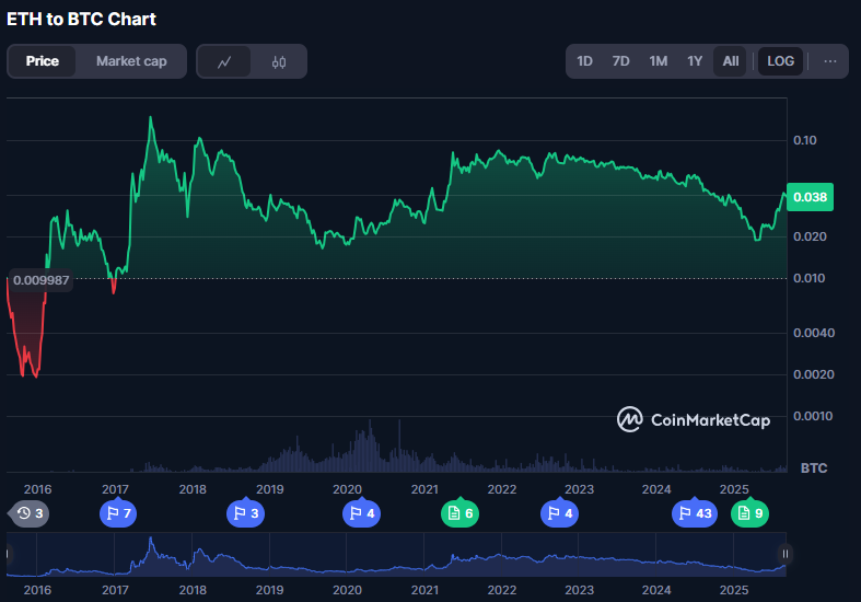 ETH/BTC has traded within a broad range since 2021 between roughly 0.025 and 0.085. After bottoming near 0.025 this summer, the pair rebounded toward 0.038. It remains below the 0.040–0.045 resistance band and the 0.05 mid-range.