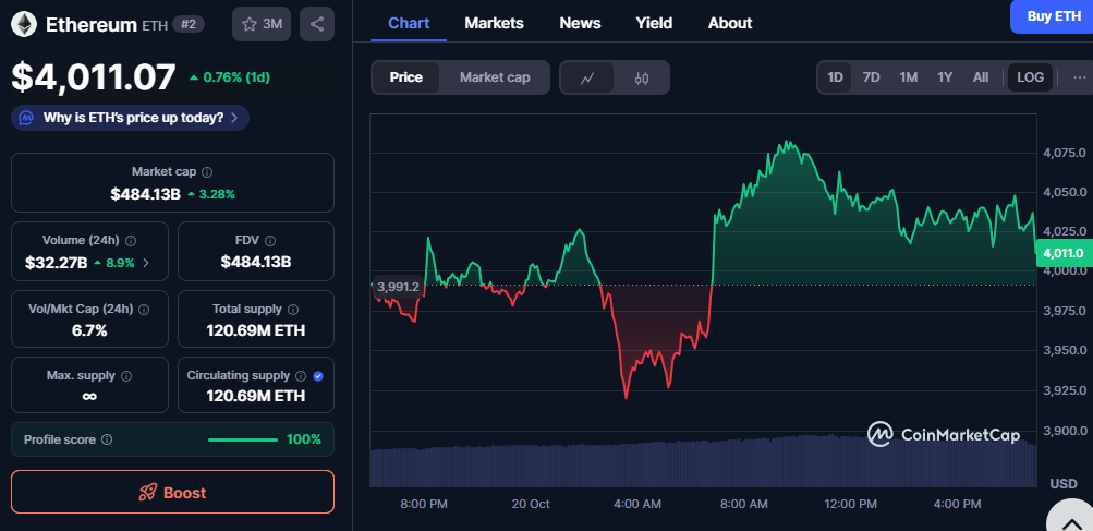 - Circulating supply sits around 120.69M ETH, so FDV ≈ market cap; focus shifts to a clean $4.08K breakout toward the mid-$4.1Ks.