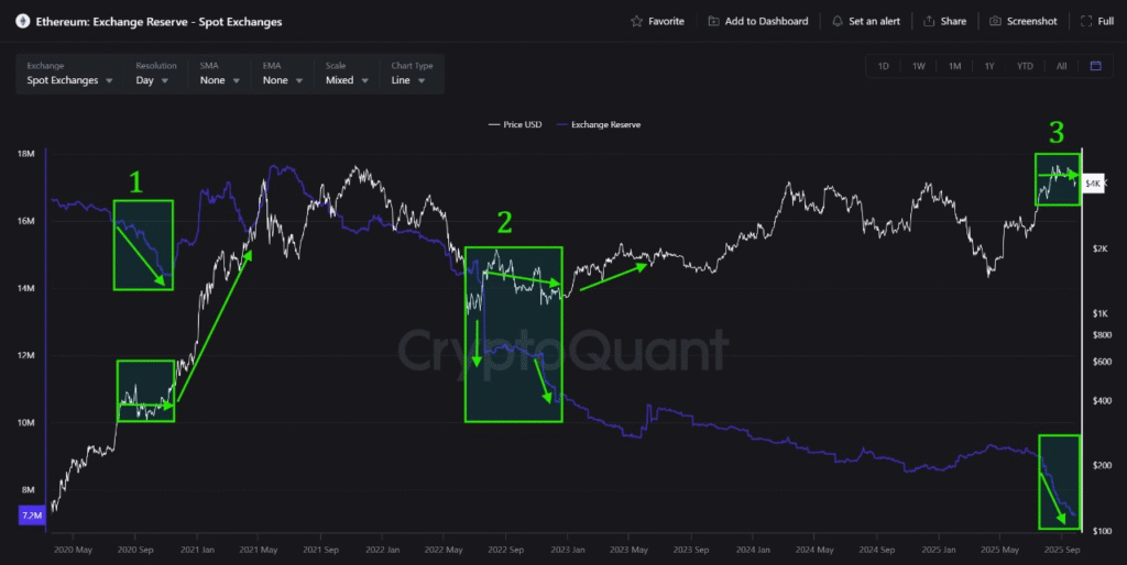 Fresh data from CryptoQuant highlights a third historic phase of exchange outflows for Ethereum. In previous cycles, similar supply drains have directly preceded dramatic rallies.