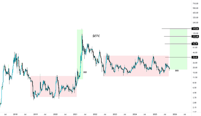 Data from historical charts shows that $ETC has been trading within a red zone for several years, indicating a period of relative stability. Analysts have noted possible target levels at 74.71, 113.00, and 174.66.