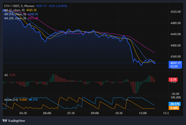 On the five-minute timeframe, Ethereum trades near $4,337 with minor declines during intraday movement. The short, medium, and long moving averages — set at 7, 14, and 30 periods — continue to slope downward. This configuration reinforces short-term selling pressure as recovery attempts face resistance near $4,375.