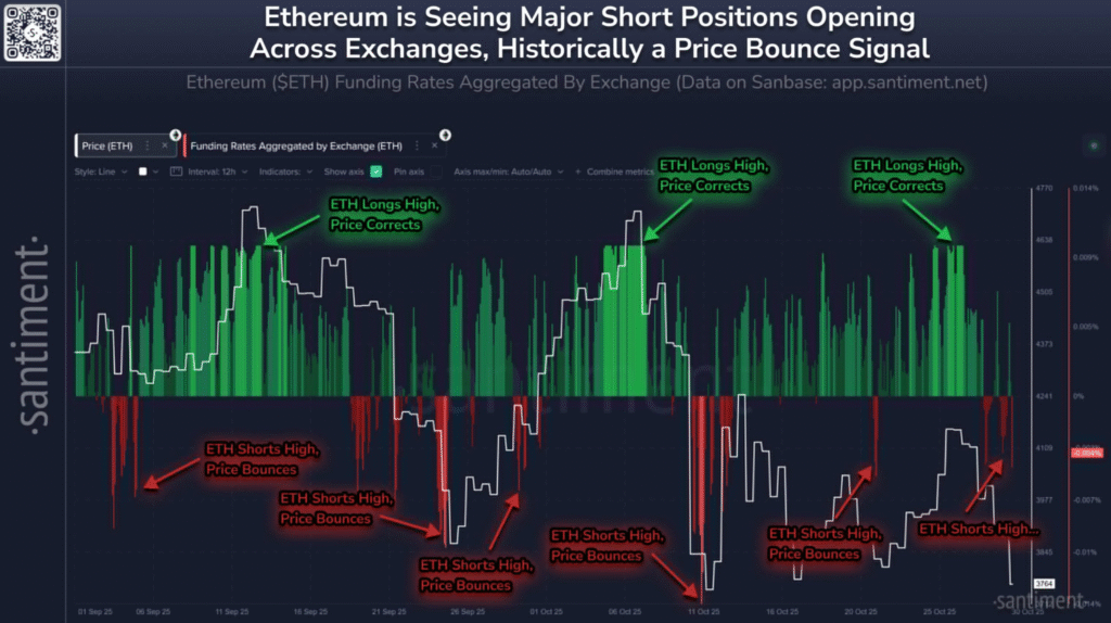 Ethereum’s funding rates have turned deeply negative, according to Santiment. “Historically, ETH tends to bounce when shorts rise fast,” Santiment said in a recent update. Short interest has surged as ETH dropped below $3,700, a trend often seen as a precursor to recovery in previous cycles.