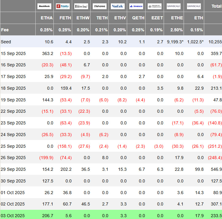 • Ethereum sees $233M inflow, led by BlackRock’s $206M investment in ETFs.