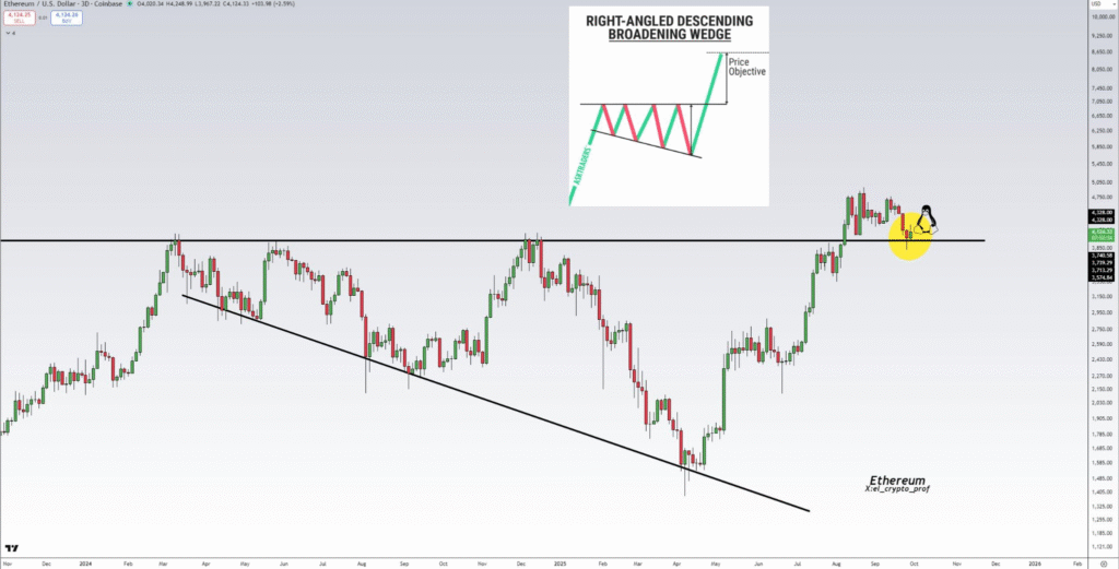 Ethereum’s technical chart is showing a Right-Angled Descending Broadening Wedge formation, which traditionally signals an impending breakout after a consolidation phase.