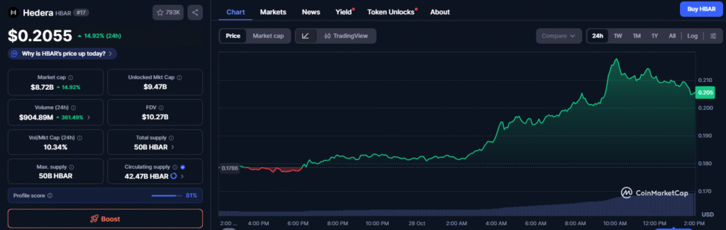 Hedera’s token HBAR continued its upward trend, rising 14.92% in the past 24 hours to trade at $0.2055. The move pushed the price above the $0.20 mark for the first time in several months.