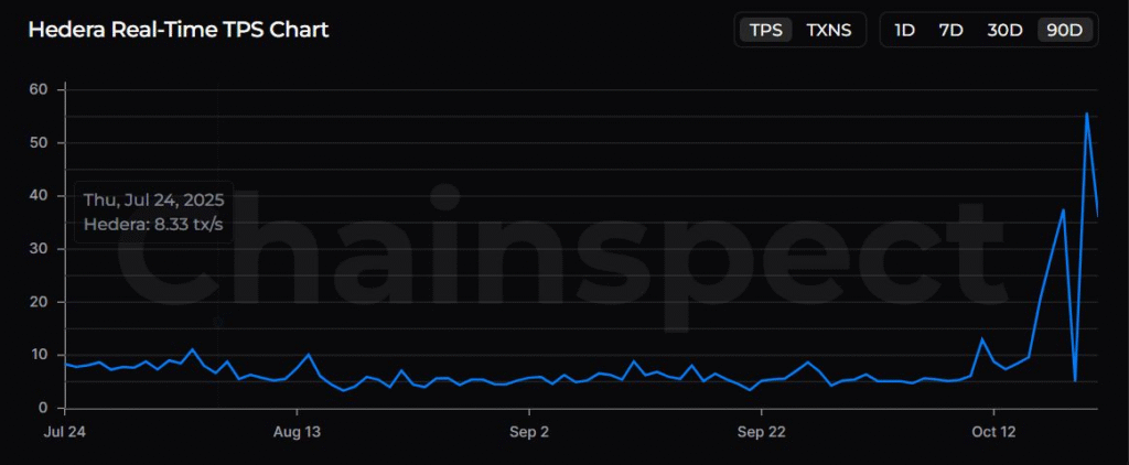 Recent performance metrics show Hedera’s transaction throughput rising rapidly. Chainspect data indicates that its transactions per second (TPS) rose by 32.75% within one hour this month.