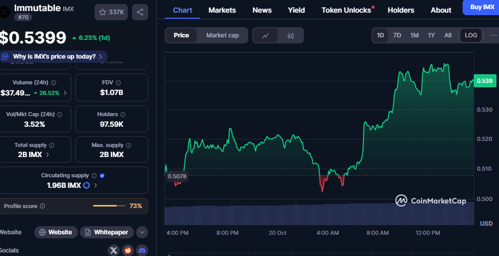 Immutable (IMX) recorded a strong upward move in the past 24 hours, rising by 6.25% to trade at $0.5399. The token began the session around $0.5078 and maintained steady gains throughout the day. It showed a clear bullish pattern, breaking short-term resistance near $0.52 before reaching a peak close to $0.54.