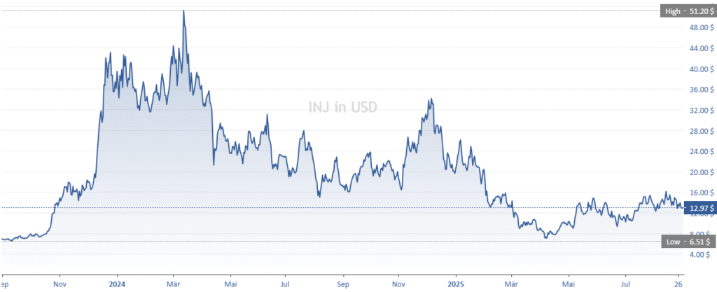 Price history reinforces the cyclical nature of Injective. The strong rally to $51, followed by sharp declines, mirrors earlier phases. Current consolidation signals preparation for another structured attempt at higher valuations.
