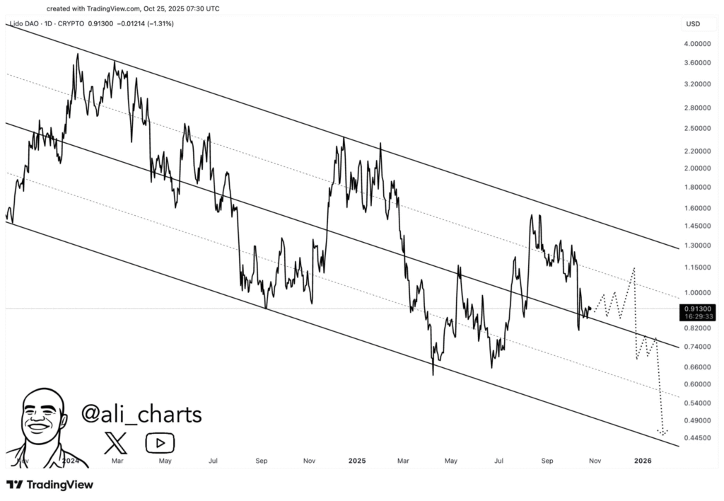 This level is viewed as a potential price floor if bearish momentum persists. According to crypto analyst Ali Martinez, $LDO remains inside a descending parallel channel and could either bounce above $1.00 or fall toward $0.45.