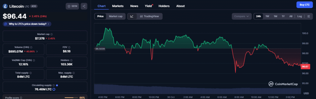 Litecoin (LTC) is trading at $96.44, down 2.45% over the last 24 hours. The asset has spent the week consolidating between $90 and $100 after multiple rejections at the $100 resistance.