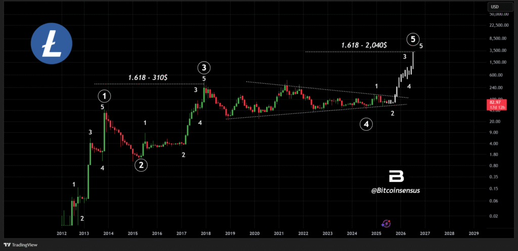 Bitcoinsensus data shows that Litecoin’s price structure follows a five-wave Elliott pattern, indicating sustained bullish momentum on the monthly chart. Historically, Litecoin has aligned closely with this pattern, reaching major peaks near the 1.618 Fibonacci extension level.Â