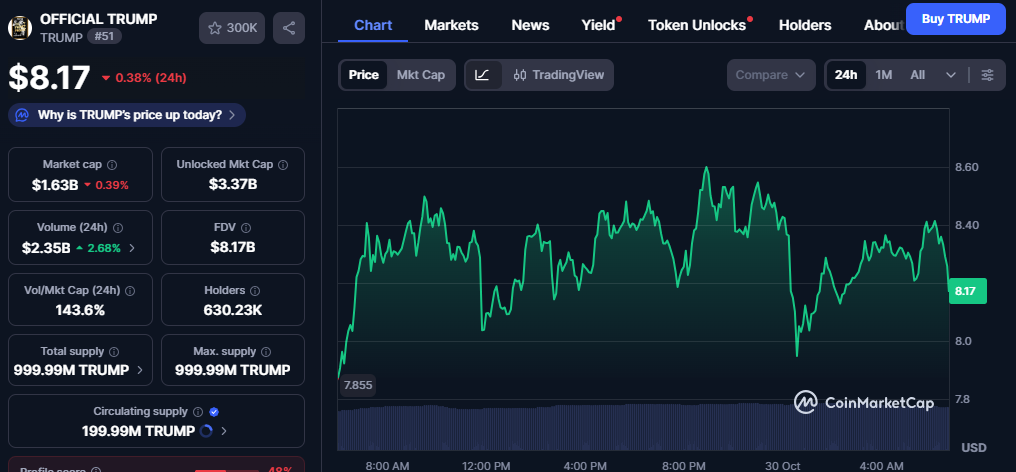 The Official Trump (TRUMP) token has made significant strides, surging by over 15% in recent days. At the time of writing, it is trading at $8.17, reflecting a 0.38% decline in the last 24 hours.