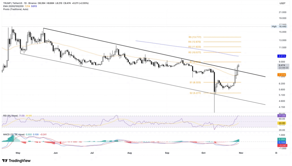 • TRUMP token eyes key resistance at $8.97 after recent 15% surge.