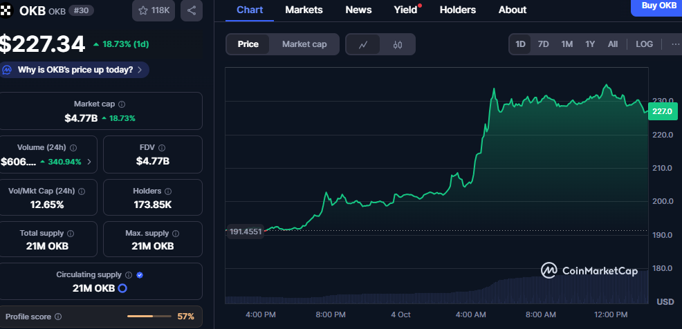 The token’s price climbed from approximately $191 to $227 in a rapid breakout, ending a prolonged consolidation phase. This clean upward movement confirmed a bullish structure after weeks of stability between $180 and $200. The surge pushed OKB’s market capitalization to $4.77 billion, securing its rank among the top 30 global cryptocurrencies.