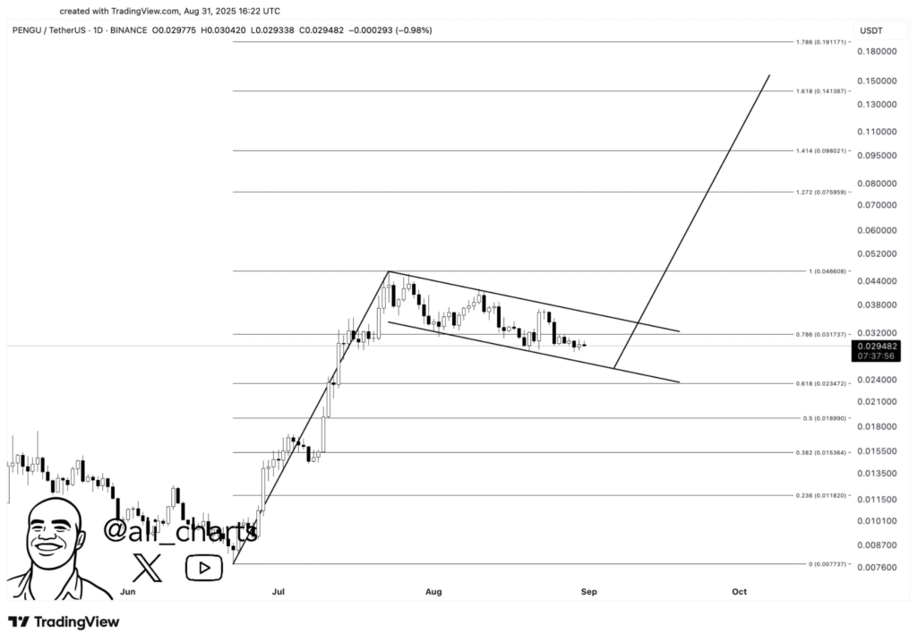 - PENGU forms a falling wedge pattern, suggesting a possible breakout this September.